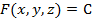 | 現在我們要研究較複雜的雙變數( )純量函數(  ),方程式如:  。一般會以對應的參數式  在 3 度空間作圖,稱為 2 維曲面(2D Surface)。或者以隱函數的方式呈現:  ,C 是常數,  。 這裡的  雖然本身是個 3 變數函數,但在條件限制其函數值必須保持一固定純量常數時,其中某個變數必將失去獨立性(independence),變成相依(dependent)於另二個變數;例如若是 z 相依於 x、y 這相依性以數學觀念呈現就是  。意即以外觀是 3 變數的函數「隱」晦包藏著其實是