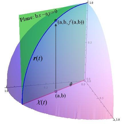 3. ,常數向量  與正 x 軸夾角 ,故  是一條以角度  通過原點的直線路徑,其對應的   亦可看成是平面  與曲面  的交截線(參考以下圖例)。